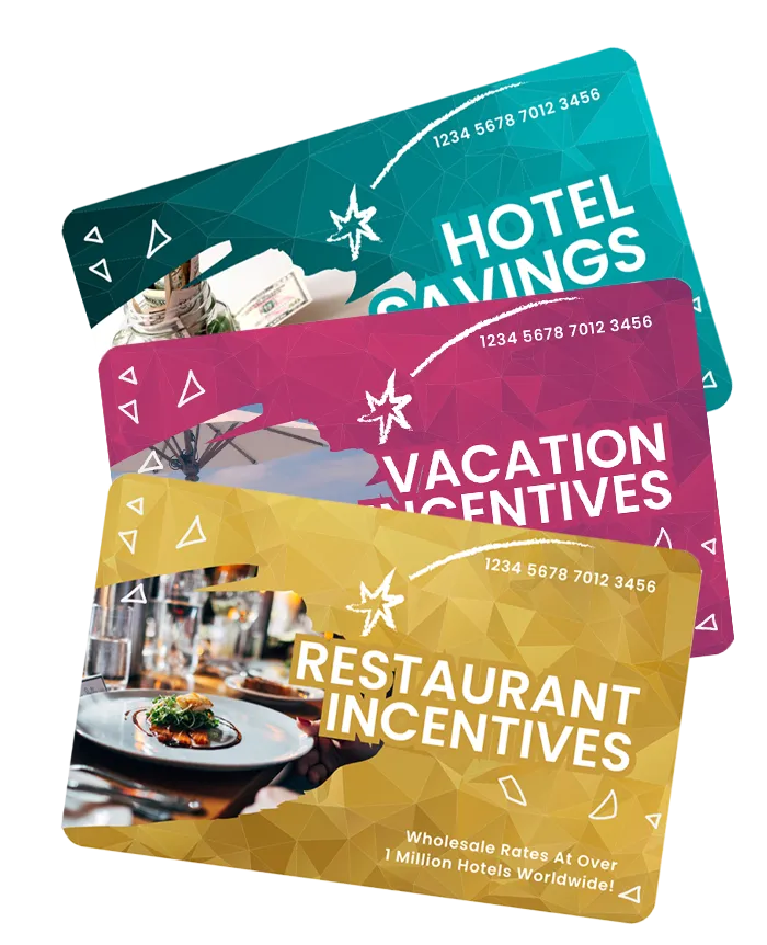 Our Hotel Savings Cards are incredibly popular incentives that you can use yourself and of course give to your clients. What are they? They are what we refer to as “Cash Credits” , a cash currency that serves as a form of payment that allows users to buy down the cost of their hotel or resort bookings. Your customer can use the cash credits at Over 1,000,000 Hotels and Resorts worldwide including Name Brands like Hilton, Marriott, Ritz Carlton, Holiday inn, Hyatt, Hampton, Ramada, Four Seasons, Starwood and many many more.